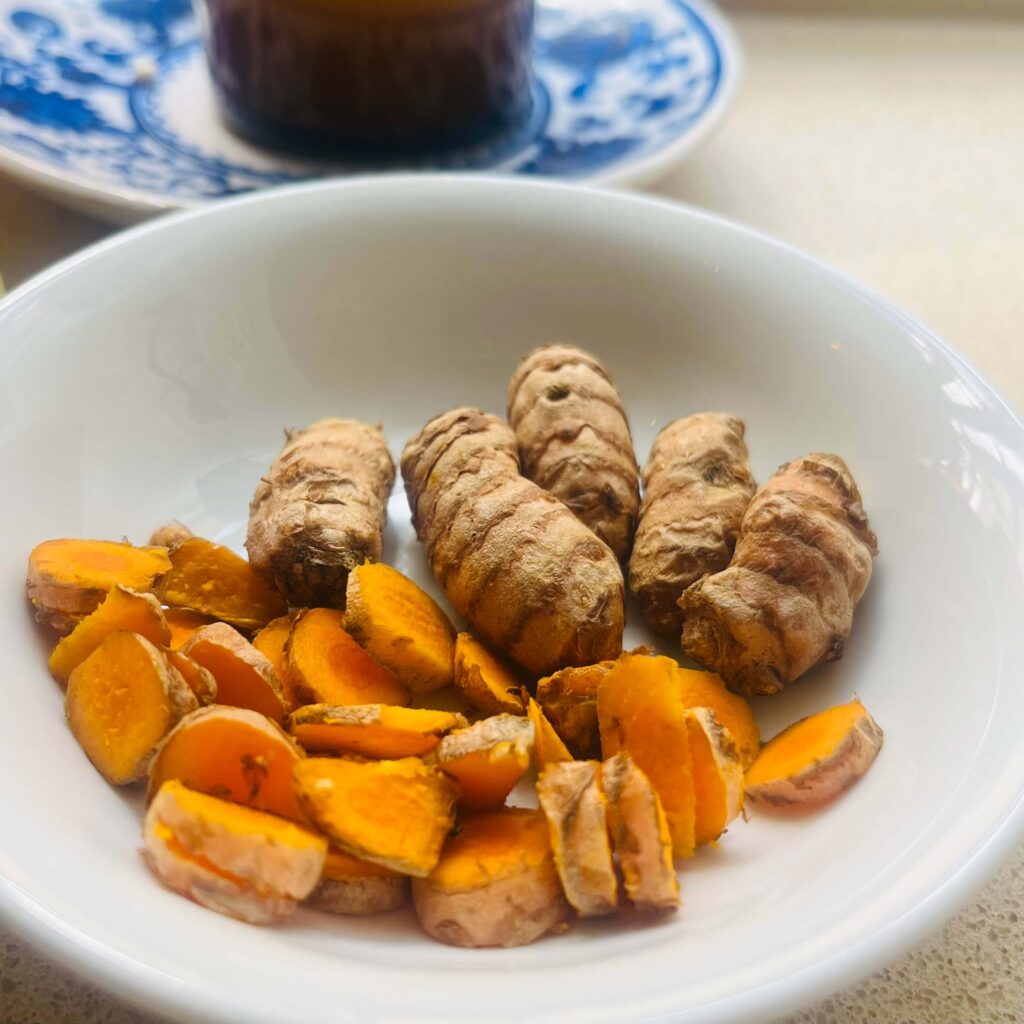 שימו לב, שורש כורכום טרי ולא התבלין המיובש. כורכום הוא צמח מרפא מאד ותיק בזירה, וכבר בימי קדם היה פופולארי מאד גם כתוסף למזון וגם ברפואה הקדומה של תרבויות המזרח (הודו, סין). בין השאר, נשות אצולה הודיות היו משפשפות את עורן בכורכום כדי לקבל צבע זהבהב ולשמור על עורן יפה וצעיר. לכורכום צבע כתמתם-צהוב זרחני ומוכר מאד והוא גם מכתים מאד ולכן צריך לעבוד איתו בזהירות אם לא רוצים כתמים צהבהבים של מאמות עסוקות על הציפורניים והאצבעות.